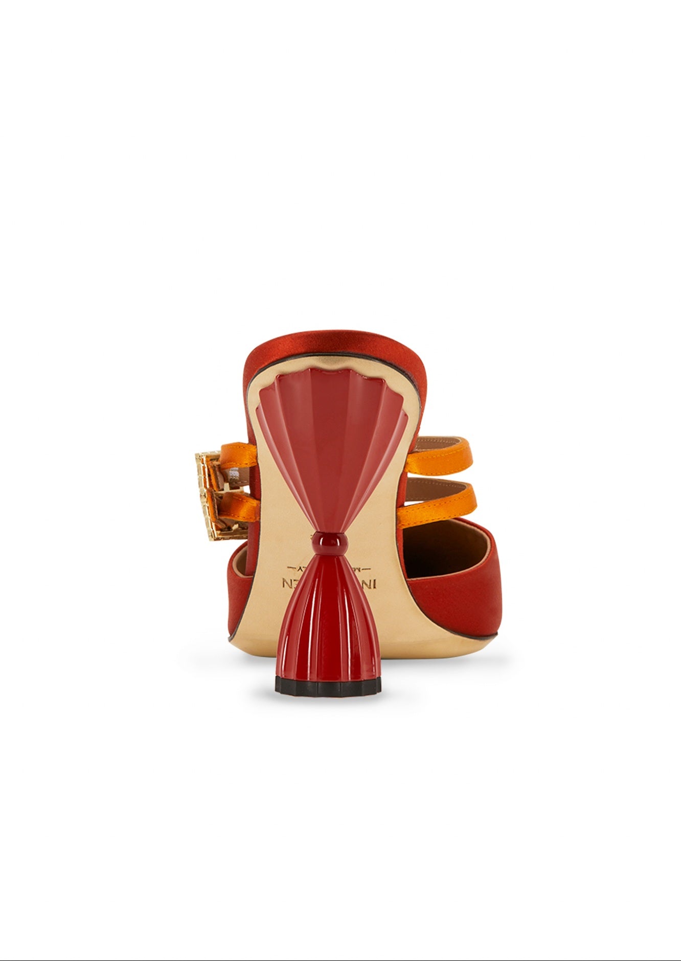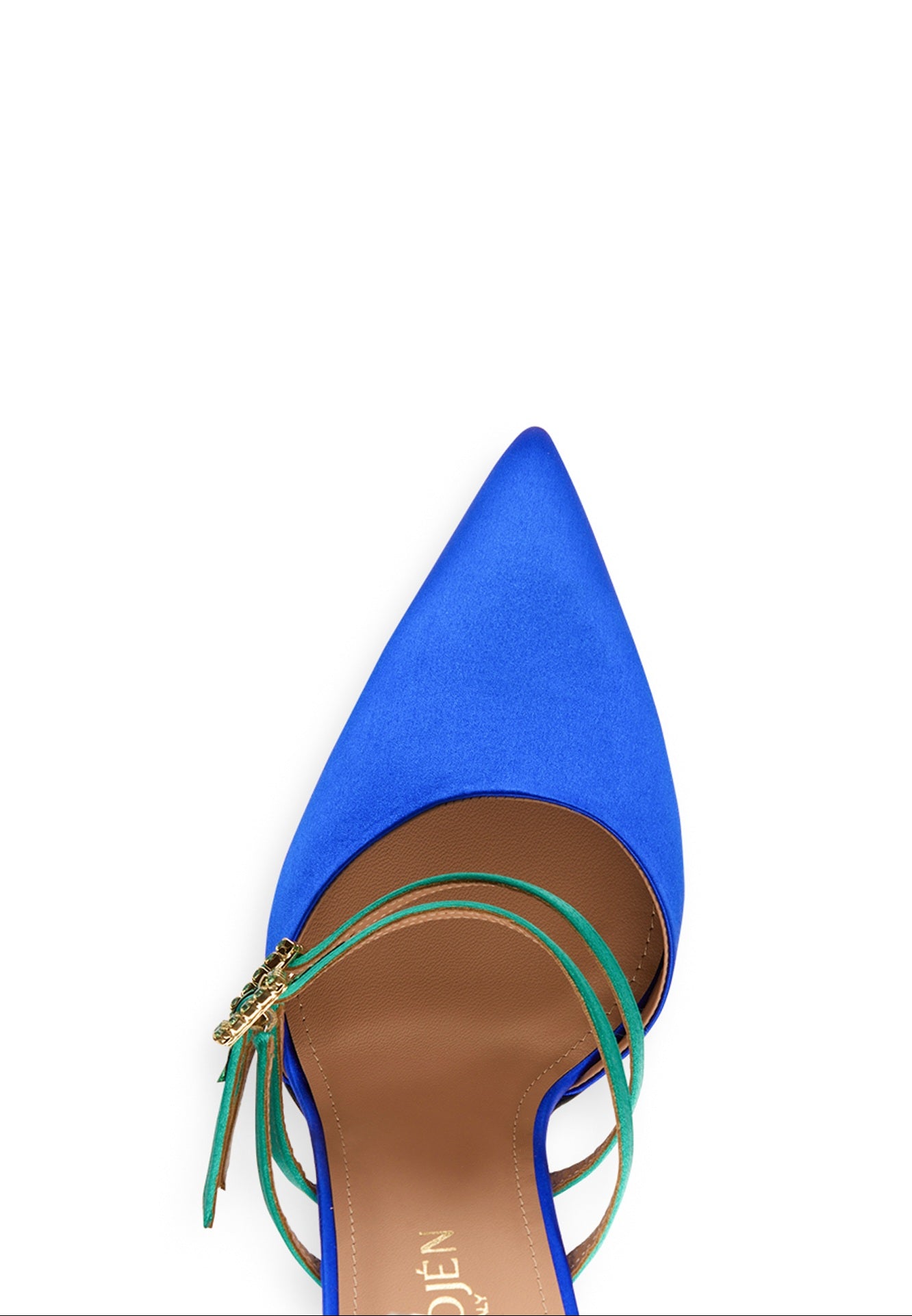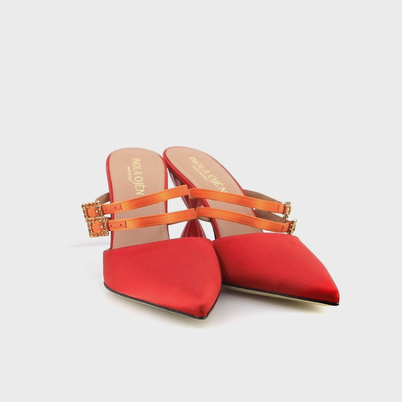 A beautiful slip-on design with crystal-embellished buckles and two straps across the top of the foot for added comfort and stability. The luxurious silk fabric gives a satin finish.